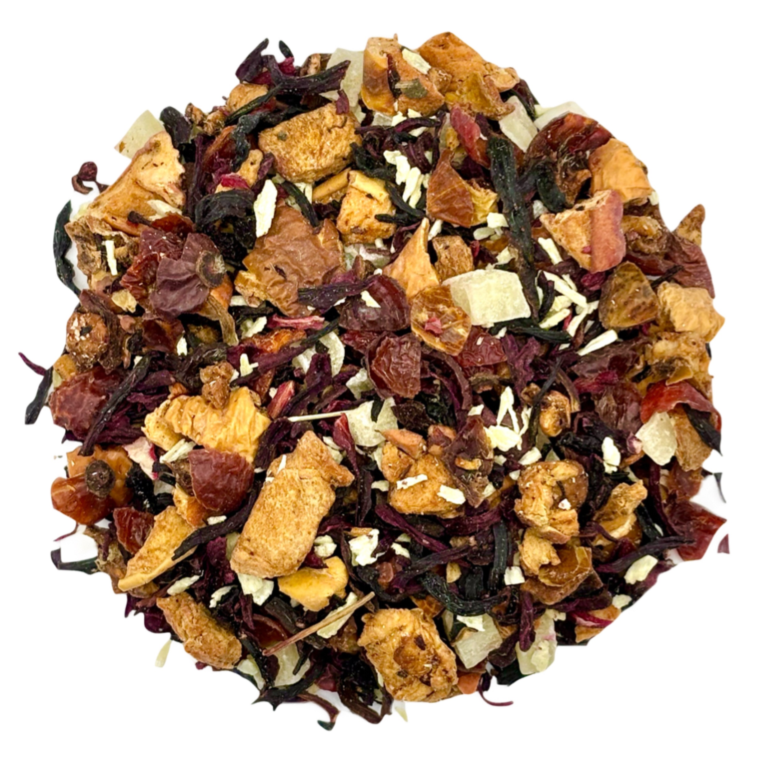 Ingredients: apple bits, hibiscus blossoms, rose hip peels, pineapple bits, coconut flakes, flavourings, natural flavouring